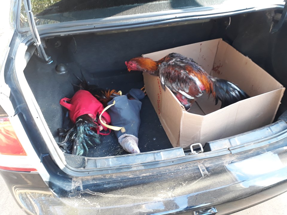 Na ocasião fora realizado buscas no veículo sendo constatado no porta-mala três galos debilitados com vestígios de maus tratos, oito esporas de plástico, uma tesoura cirpurgica e duas bolsas para transporte das aves.