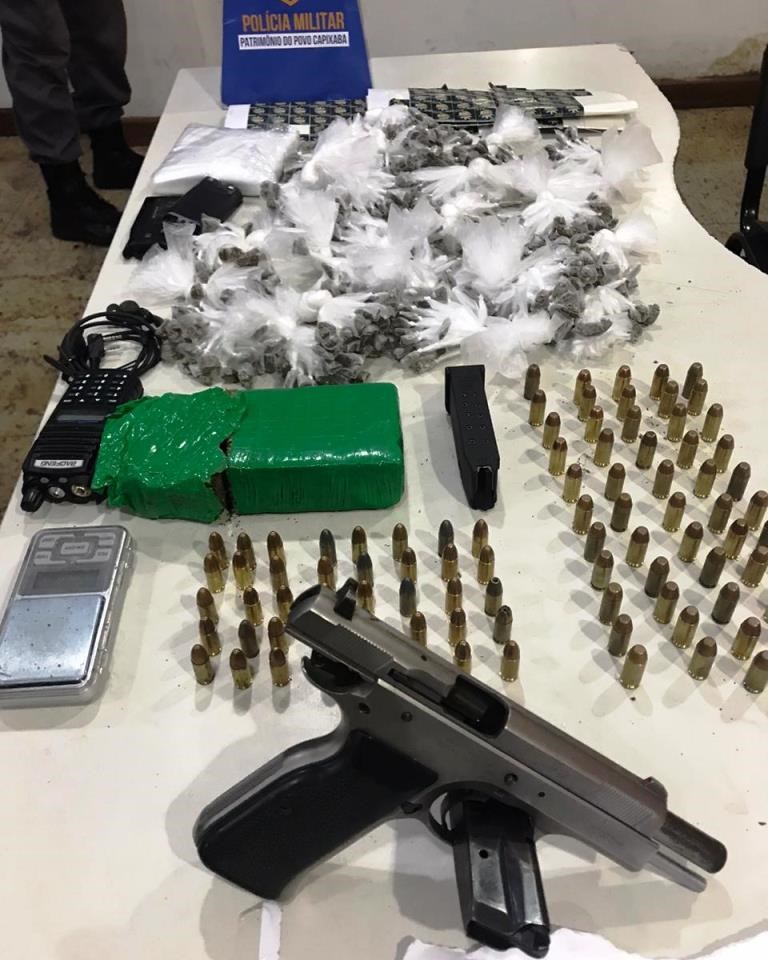 Dentro da residência, utilizada como esconderijo dos traficantes foram encontrados 01 pistola italiana cal 9mm com um carregador contendo 10 munições, 01 carregador de pistola Glock cal .40, 55 munições cal .40, 40 munições cal 9mm, 728 buchas de maconha, 01 tablete de maconha de aproximadamente 450g, 01 balança de precisão, 01 rádio comunicador, 02 baterias para rádio comunicador e 01 fone de ouvido.