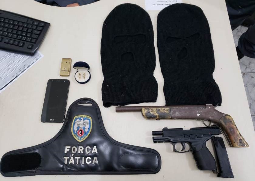 Durante a fuga os criminosos deixaram uma bolsa no chão próximo a motocicleta. Dentro dela foi encontrada uma arma de fogo de fabricação caseira, um simulacro de arma de fogo tipo pistola, duas toucas ninjas, uma faca e algumas peças de roupas.