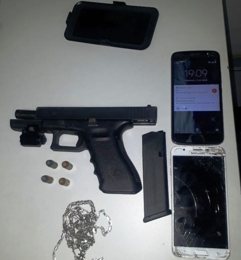 No final da tarde deste domingo, foi repassada às guarnições a informação de que os suspeitos de terem cometido um homicídio no bairro Caratoíra momentos antes, estavam a bordo de um veículo Fiat Uno em direção ao bairro São Pedro. Policiais que faziam patrulhamento na região realizaram o cerco em um ponto estratégico e localizaram o veículo. Após acompanhamento o automóvel dos suspeitos colidiu na traseira de um coletivo e o motorista conseguiu fugir, sendo detido apenas o passageiro. Com o detido, identificado como T.A.C., 28 anos, foi encontrada uma pistola calibre .40, com mira a laser acoplada e quatro munições.