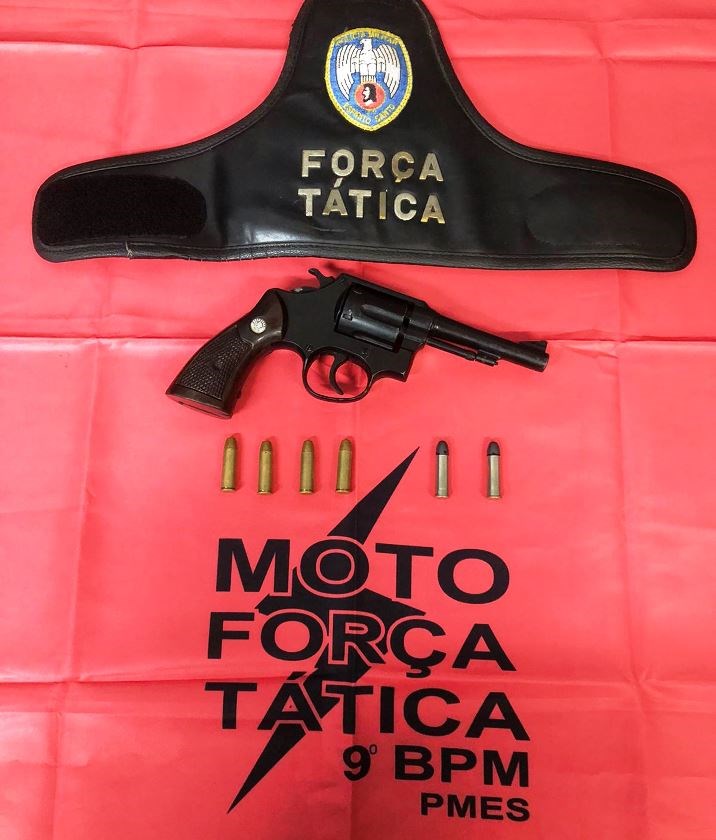 Militares da Moto Força Tática do 9°Batalhão, durante patrulhamento na Rua Valdecir Simões, visualizaram um homem correndo pela rua com um objeto na mão. Ele dispensou o material ao visualizar os policiais e tentou fugir por um beco. O suspeito foi alcançado e abordado. Os militares recolheram o objeto que estava enrolado em um pano, sendo um revólver calibre 38, com seis munições.