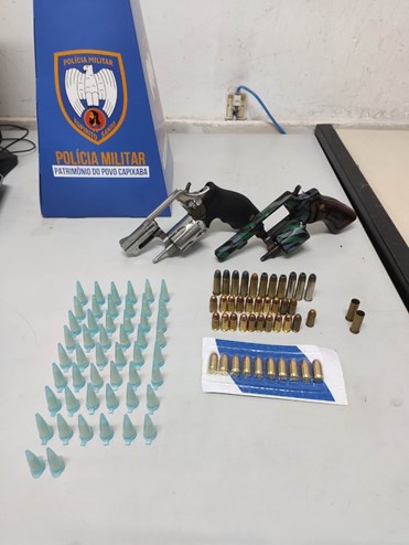 Em outra ação, também no bairro Cidade Continental, militares avistaram dois indivíduos, sendo que um deles carregava uma mochila. Ao avistarem a aproximação policial, um dos suspeitos fugiu, deixando pra trás uma bolsa contendo 01 revólver cal .38, 01 revólver cal. 357, 31 munições cal.380, 08 munições cal.38 e 03 munições cal. 357, além de 50 pinos de cocaína. Um suspeito foi detido.