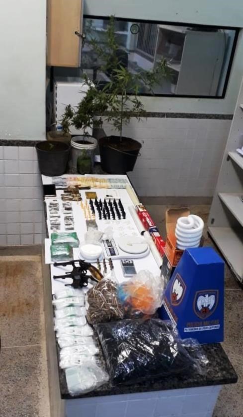 Após a abordagem foram localizados dois revólveres calibre 32, nove munições do mesmo calibre, cinco munições do calibre 38, três tabletes de maconha, 16 buchas grandes e duas pequenas de maconha, 84 pedras de crack, um papelote de crack moído, 91 pinos de cocaína, cinco vasos de pé de maconha, duas balanças de precisão, uma luminária para estufa, R$1.673,00 em dinheiro e vasto material para embalo de entorpecentes.
