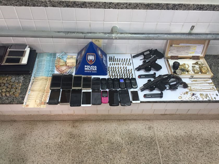 No local foram apreendidos duas pistolas calibre 380, dois calibre 38 e revólver calibre 32, além de vários documentos falsos, farta munição de diversos calibres, jóias, aparelhos eletrônicos e R$ 11.135,15 em espécie.