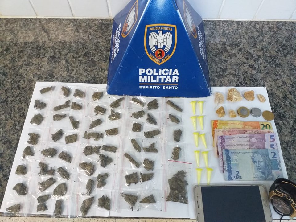 A equipe realizava o patrulhamento quando abordou dois homens que estavam em atitude suspeita. Durante a busca pessoal foram localizadas 58 buchas de maconha, 10 pinos de cocaína, seis pedras de crack e certa quantia em dinheiro.