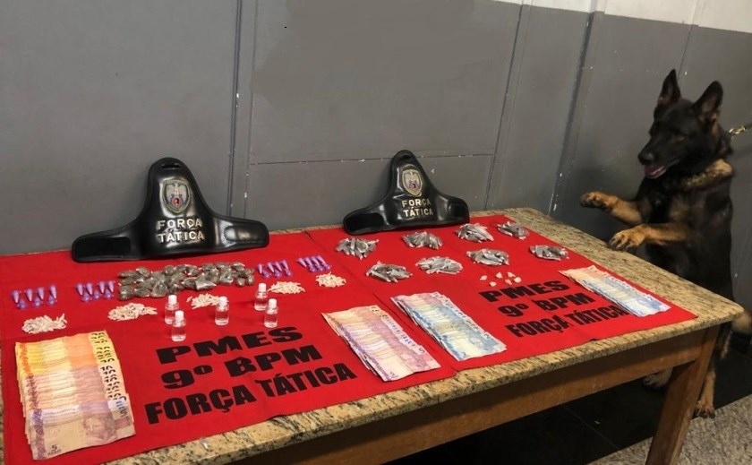 Com ajuda do cão Messi, a Polícia Militar apreendeu 120 tiras e 39 buchas de maconha; 28 pinos de cocaína; 180 pedras pequenas e sete porções médias de crack; além de cinco frascos de “loló”. Um total de R$ 615 em espécie também foi apreendido.