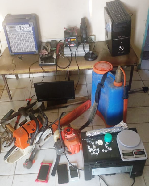 Com a dupla os militares recuperaram grande parte dos objetos furtados e apreenderam drogas e materiais utilizados para o preparo de entorpecentes. O veículo utilizado no roubo também foi apreendido.