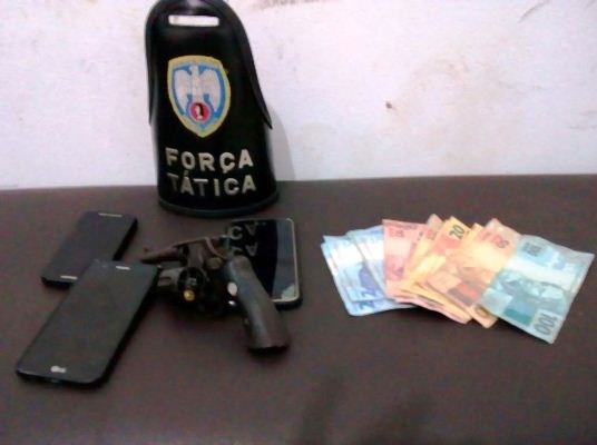 Enquanto uma viatura abordava o Gol preto, a outra seguiu os suspeitos que estavam montados na motocicleta roubada. Durante o acompanhamento, o condutor da moto perdeu o controle e caiu. No local foram abordados F.M.F. e o menor J.V.S.C. Ao revistar a dupla, os policiais encontraram na cintura de F.M.F. um revólver calibre .32.