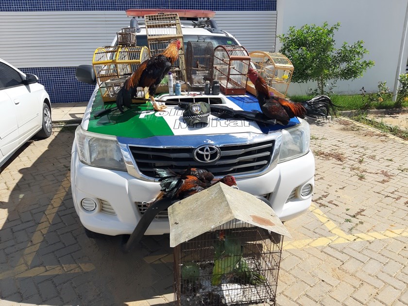 Ao chegar ao local, de imediato os policiais já visualizaram os pássaros silvestres em gaiolas, pendurados na parede da residência denunciada. Ao prosseguir com a vistoria, a equipe flagrou dois galos com sinais claros de maus tratos, como as esporas cerradas e um deles com um olho perfurado, ferimentos característicos de animais expostos às brigas em rinhas. Ainda na mesma residência, foi encontrado um papagaio e dois coleiros mantidos em cativeiro, todos de forma irregular.