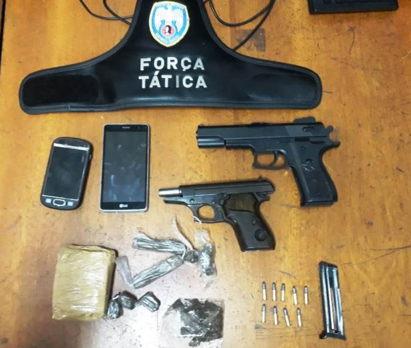 Com A.M.C.A., de 18 anos, os policiais encontraram quatro buchas de maconha e um simulacro de arma de fogo e com A.S.N., de 32 anos, foi encontrada uma bucha de maconha.