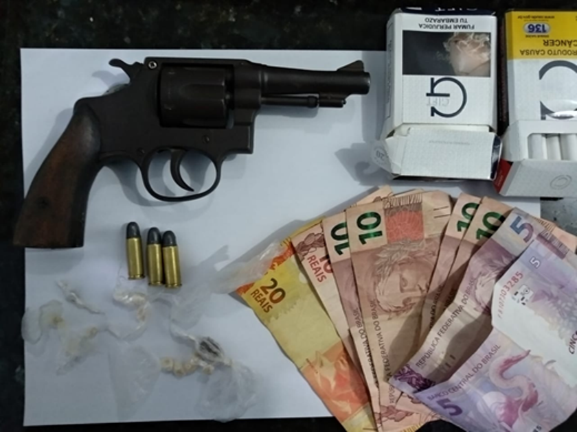Com o trio foi encontrado um revólver calibre 38, três munições, 11 pedras de crack, cigarro de maconha e R$80,00, proveniente da venda dos entorpecentes.