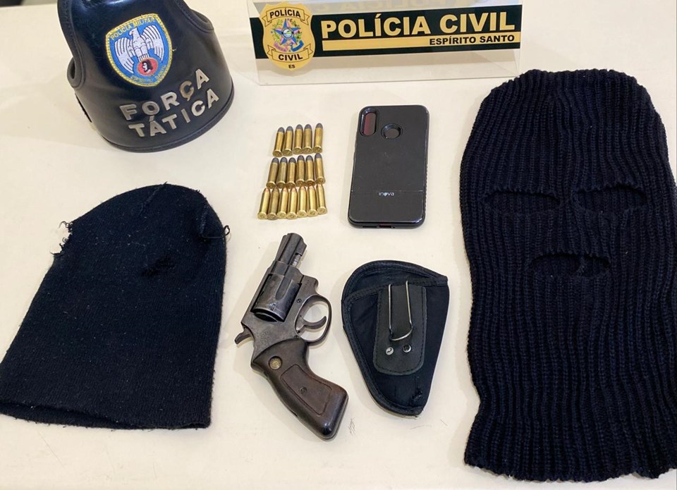 Durante as buscas na residência, foi apreendido um revólver calibre 38, 18 munições do mesmo calibre, um coldre de revólver, além de duas toucas ninja.