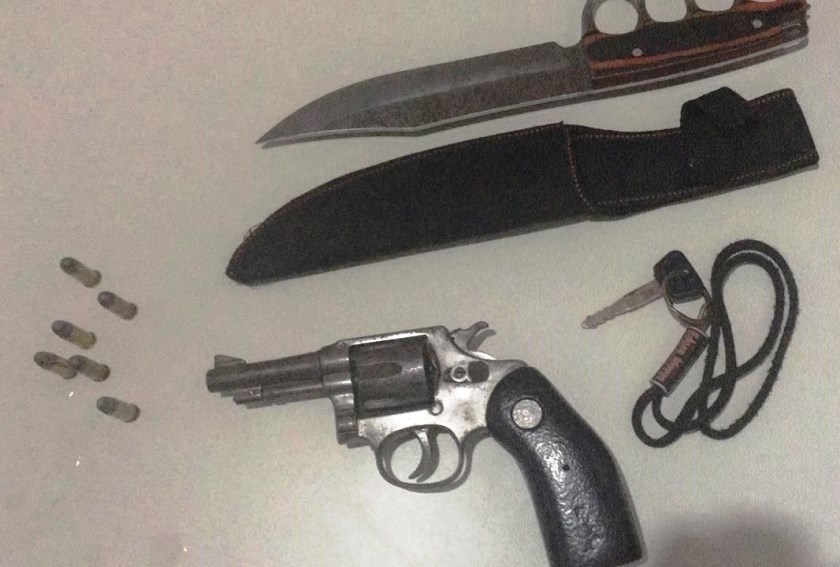 A motocicleta foi alcançada e os suspeitos foram abordados. Em posse de M.A.C., 44 anos, e J.G.M., 16 anos, foi encontrada uma faca. Com o apoio de outra viatura foi realizada uma varredura e localizado um revólver calibre 32 com seis munições.