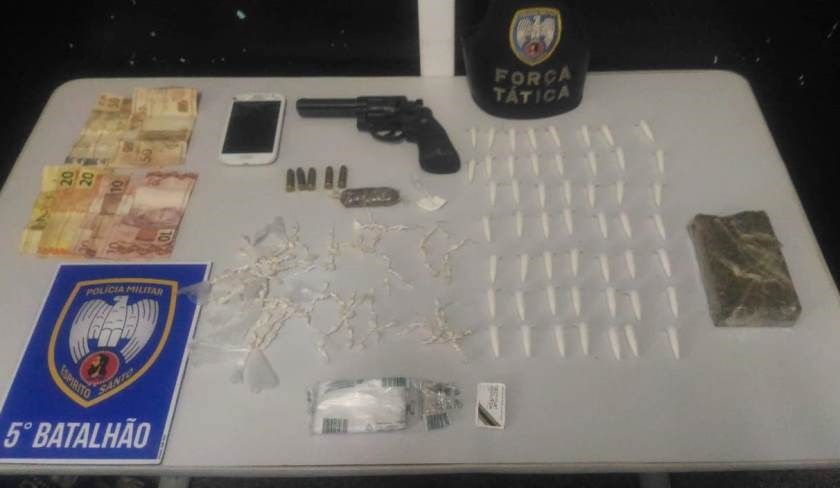 Após recebimento de denúncias de que um casal estaria comercializando entorpecentes em uma residência de Barra do Riacho, militares da Força Tática se deslocaram ao local informado, onde realizaram uma abordagem a um casal próximo ao imóvel com características semelhantes às informadas na denúncia. Os abordados foram identificados como M.S.W., 18 anos e R.S.S.J., 14 anos., mas nada de ilícito foi encontrado com eles. Após buscas na residência, os militares encontraram um revólver calibre 38, municiado com seis munições; 51 pinos e um papelote de cocaína; 120 pedras de crack; um tablete de maconha pesando aproximadamente 324 gramas; uma bucha da mesma droga; R$ 310,00 em espécie e material para embalo de entorpecentes.
