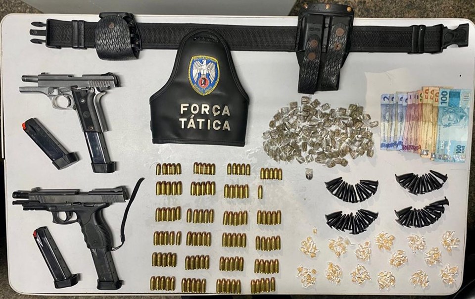 No bairro Itaputera, após abordagem e um veículo envolvido no tráfico que estava aterrorizando os moradores, a equipe de Força Tática apreendeu duas pistolas .40, dois carregadores sobressalentes, 96 munições de .40 , 20 munições de 380, 100 buchas de maconha, 141 pedras de crack, 91 pinos de cocaína, um cinto N.A e R$309,00 em espécie. Dois homens foram detidos na ação.