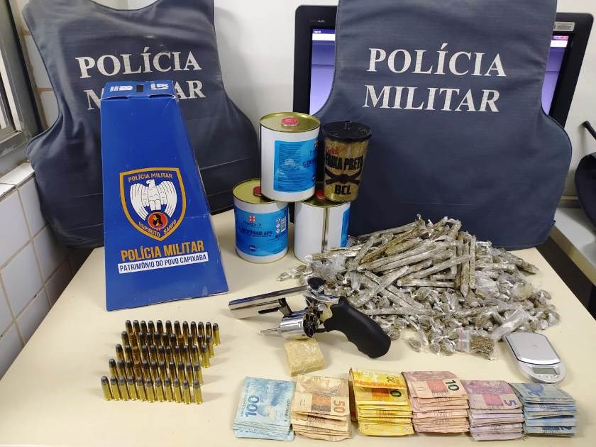 Em Guarapari, no bairro Nossa Senhora da Conceição, na tarde de ontem (14), um homem foi detido e com ele foi encontrado dois revolveres calibre 32, munições e drogas, incluindo três tabletes de maconha pesando quase um quilo e 91 pinos de cocaína, também foram encontrados cinco vasos com pés de maconha e 1,673 reais em espécie.