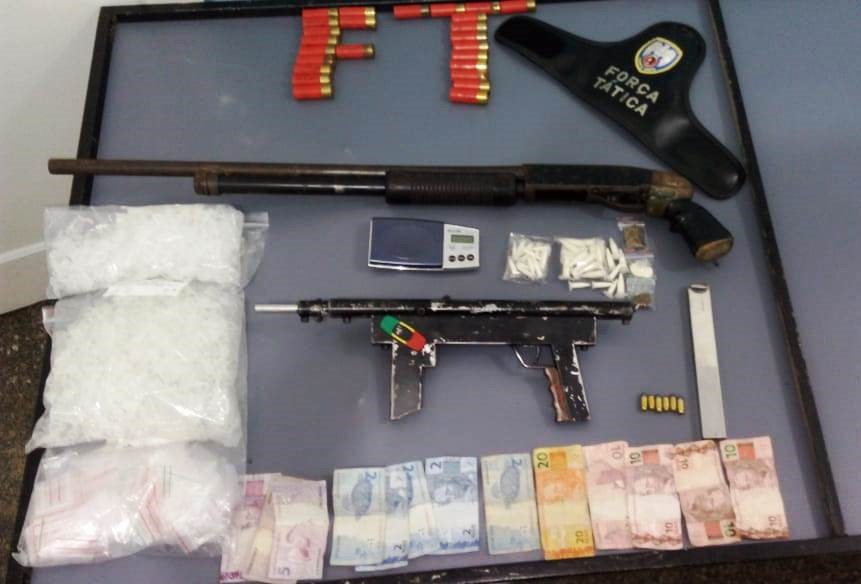 Já na sexta-feira (30), durante patrulhamento pelo bairro Cupido, por volta de 21 horas, a Equipe da Força Tática avistou um homem e duas mulheres em atitude suspeita. Foi realizada a abordagem e os suspeitos identificados como S.B.L., de 15 anos, L.D.S., de 15 anos e U.S.P., de 18 anos. Com eles nada de ilícito foi encontrado, apenas três aparelhos celulares e R$34,00 em espécie. Próximo aos suspeitos foi encontrada uma sacola contendo uma bucha de maconha. Após buscas nas proximidades, também foi encontrada uma espingarda calibre 12 com oito cartuchos de mesmo calibre. Os suspeitos confessaram que estavam traficando no local e que o restante do entorpecente estaria em uma residência no bairro Guanabara. No endereço informado, os policiais observaram que um homem ao perceber a aproximação da guarnição arremessou duas sacolas no telhado da residência vizinha. Posteriormente foi verificado que as sacolas continham 30 pinos de cocaína. Após buscas na residência, foi localizada uma submetralhadora de fabricação caseira calibre 380 com seis munições de mesmo calibre e um carregador. Também foram encontrados mais oito pinos de cocaína, farto material para embalo de entorpecentes, R$85,00 em espécie, um aparelho celular, um papelote de cocaína, uma bucha de maconha, 17 cartuchos calibre 12 e uma balança de precisão.