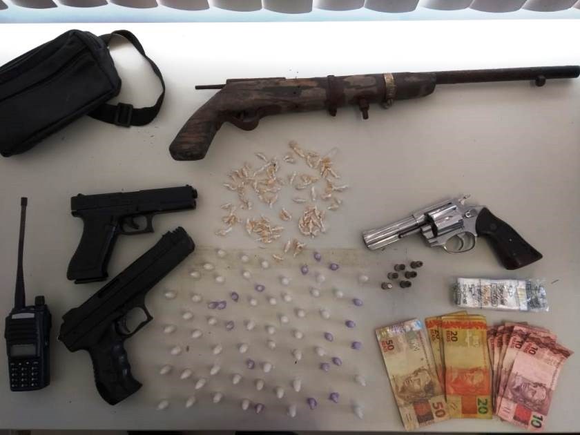 Enquanto estavam realizando as buscas, receberam informações de que um suspeito estaria em posse de arma de fogo e comercializando entorpecentes nas imediações. Os policiais abordaram E.V.A., de 19 anos, e com ele foi apreenderam um revólver calibre 38 com seis munições intactas, rádio comunicador, dinheiro em espécie, uma espingarda de fabricação caseira e 82 pedras de crack e 67 pinos de cocaína. O jovem foi detido.