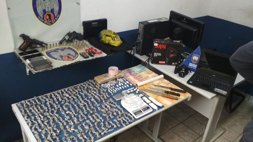 Os militares abordaram as três pessoas que estavam dentro do imóvel. W.J.L. de 25 anos, W.R.S.C. de 23 anos e uma adolescente de 17 anos. Após buscas foram localizados uma pistola calibre 32, um revólver calibre 38, 42 munições, dois tabletes de 720g e 461 buchas de maconha, seis pinos, 28 papelotes e três invólucros de pasta base de cocaína, R$ 1.075,00 em espécie, além de de objetos entre roupas, ferramentas e aparelhos eletrônicos.