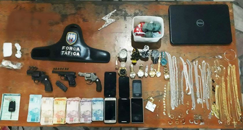 A outra equipe deslocou até a casa de F.H.V.G., onde foi encontrado o revólver calibre 22, que fora comercializado minutos antes, além de um revólver calibre. 38, com cinco munições e uma pistola calibre 6.35 com um carregador contendo sete munições de mesmo calibre. Também foram apreendidas 121 pedras crack, uma pedra grande da mesma droga, uma pequena porção de cocaína, 13 relógios de pulso, 12 cordões similares a ouro, oito cordões similar a prata, cinco pulseiras similares a ouro, quatro pulseiras similares a prata, oito anéis similares a ouro, cinco anéis similares a prata, dois pingentes similares a ouro, sete brincos similares a ouro e três brincos similares a prata e um valor R$ 3.013,00 em espécie.
