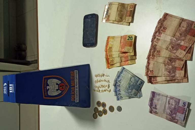 Após receber informações do serviço de inteligência (P2) da unidade, relatando que um indivíduo estaria comercializando entorpecentes do bairro, policiais militares do serviço ordinário foram ao local, abordaram o suspeito e apreenderem em posse dele R$ 307,50.