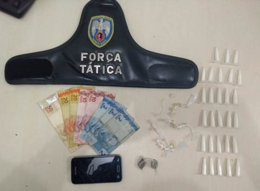 Durante a fuga o suspeito tentou dispensar um aparelho celular, uma carteira e uma sacola contendo os 28 pinos de cocaína, 19 pedras de crack e duas buchas de maconha.