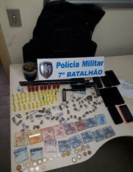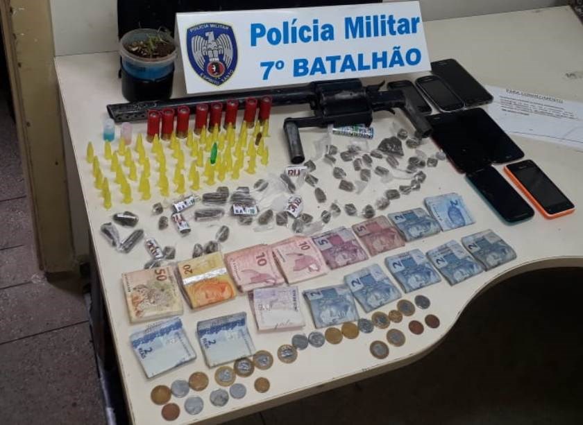 No bairro Aparecida, em Cariacica, os policiais receberam informações de homens estavam traficando drogas e portando armas de fogo. Durante o patrulhamento os militares observaram quando dois homens correram e invadiram uma casa. Nessa residência foram apreendidas drogas e a arma, sendo detidos dois casais. Ainda durante as ações, outras quatro pessoas foram detidas na rua com drogas e dinheiro. No total, os policiais apreenderam uma escopeta calibre 12, oito munições do mesmo calibre, 60 buchas de maconha, 60 pinos de cocaína, dois frasco de loló, uma placa e uma capa de colete balístico, R$ 523,00 em espécie e sete aparelhos celulares. Foram apreendidos os adolescentes L.O.C., de 13 anos, A.S.R., de 14 anos, E.S.R., de 17 anos, M.S.C., de 16 anos e R.S.P., de 16 anos, e foram detidos B.G.A., de 20 anos, R.S.F., de 21 anos e L.V.C., de 27 anos.