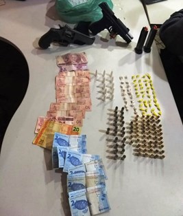 No Bairro Romão, em Vitória, os policiais detiveram R.G.S., de 19 anos e S.A.L., de 24 anos, conhecido como “Grilo”. Com a dupla os militares apreenderam uma pistola calibre 380, três carregadores, 55 munições do mesmo calibre, um revólver calibre 38 e 21 munições do mesmo calibre, além de 59 pedras de crack, 11 pinos e cocaína, R$ 160,00 em espécie, um coldre e materiais utilizados para o embalo dos entorpecentes.