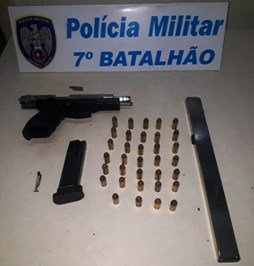 Ainda em Cariacica, no Bairro Nova Rosa da Penha I, os policiais da 4ª Companhia do 7º Batalhão faziam o patrulhamento quando avistaram um jovem com uma arma de fogo em mão. O suspeito fugiu, sendo alçado pelos militares em uma residência. No local foram apreendidos uma pistola calibre.40, um carregador normal e um outro alongado e 34 munições do mesmo calibre. M.C., de 23 anos, conhecido como “Ball”, foi detido.