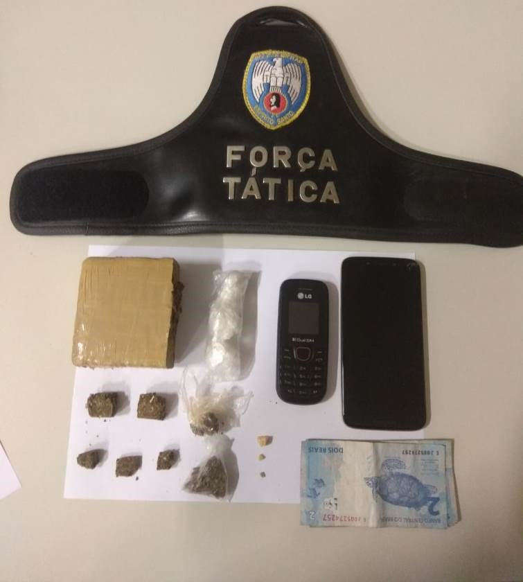 Os dois foram abordados e confirmaram a denúncia. Além do tablete de aproximadamente 250g mencionado, também foram apreendidos dois pedaços grandes, três pequenos e duas buchas de maconha, duas pedras pequenas e uma maior de crack, R$8,00, dois celulares e material para embalo de entorpecentes.