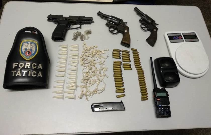 No endereço indicado, os policiais perceberam que três suspeitos fugiram ao avistarem a guarnição. Após acompanhamento, foram detidos R.R.S., de 19 anos, portando ilegalmente um revólver calibre 38 com seis munições de mesmo calibre e uma mochila contendo uma balança digital de precisão, 169 pedras de crack, 26 pinos de cocaína, quatro buchas de maconha, um rádio comunicador e outras 15 munições calibre 38.