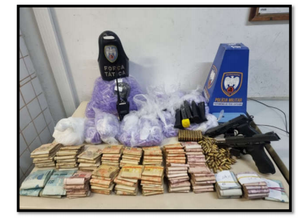 Nesta quarta (27), os militares prenderam um homem no município de Serra. Com ele os policiais R$ 37.929,00 em espécie, duas pistolas calibre 9mm, carregadores, 132 munições de diferentes calibres, 1396 pinos de cocaína e um radio comunicador, além de outros materiais.