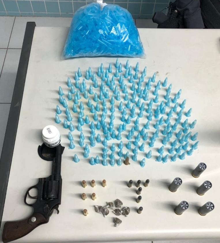 Após a abordagem e busca pessoal, dois irmãos de 19 e 18 anos foram detidos com um revólver calibre 38, 17 munições, ácido bórico, 197 pinos de cocaína e sete buchas de maconha.