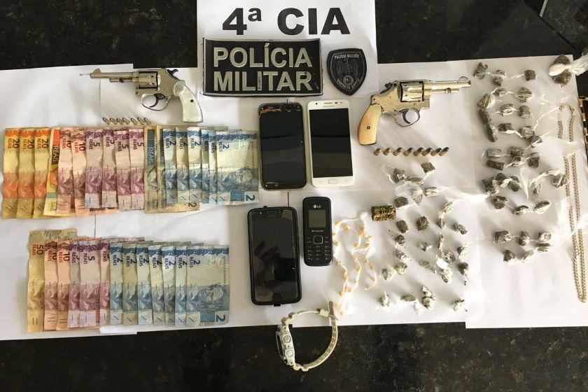 Na residência de D.F.F.A., de 20 anos, foram encontradas 40 buchas de maconha e a quantia de R$ 143,40 e um aparelho celular. Na residência de P.V.S., de 19 anos foi apreendido o revólver calibre 22, com numeração raspada, e sete munições. Na residência de A.R.S., de 20 anos, os policiais apreenderam um revólver calibre 32 e oito munições.