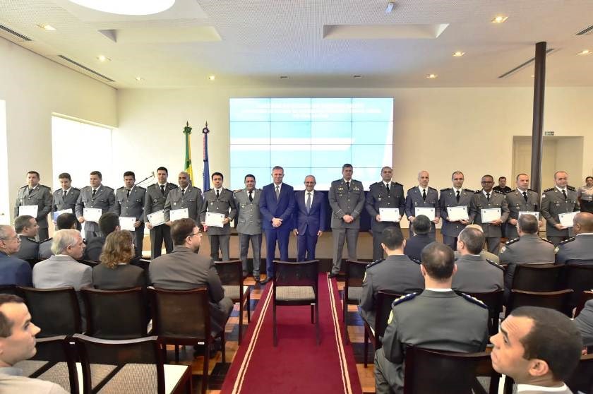 Na manhã desta terça-feira (13), no Salão São Tiago do Palácio Anchieta, foi realizada a formatura do Curso de Aperfeiçoamento de Oficiais (CAO) 2018. O curso é um requisito legal para a promoção do capitão ao posto de major. Participaram da formatura 38 capitães da Polícia Militar e três capitães do Corpo de Bombeiros Militar.