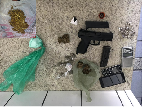 Durante as buscas foram apreendidos um réplica simulacro de pistola com dois carregadores, dois pedaços grandes de maconha, sete buchas da mesma droga; um pino de cocaína; uma balança de precisão, sete munições calibres 38, aparelhos celulares e outros materiais de procedência ilícita/duvidosa. Um jovem de 20 anos foi preso e um adolescente de 16 anos foi apreendido.