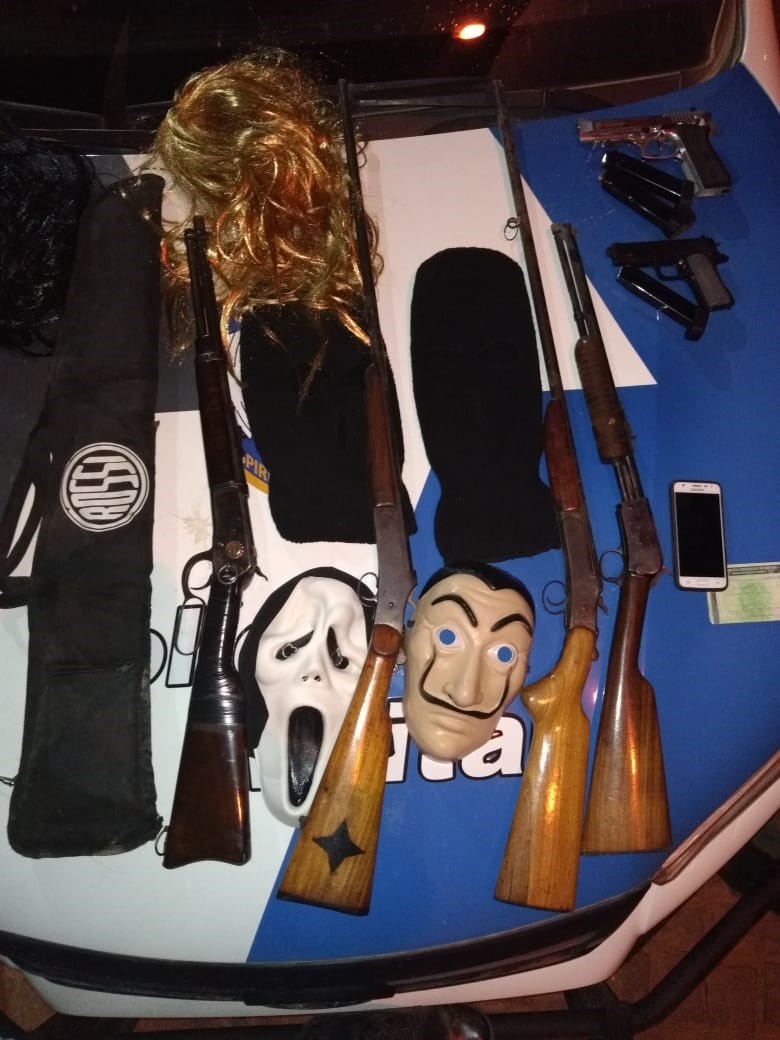 Na residência do suspeito, os militares encontraram dois rifles, sendo um calibre 38 e outro calibre 22, duas espingardas calibre 36, um carregador de pistola calibre 380, máscaras/perucas e duas toucas ninja.
