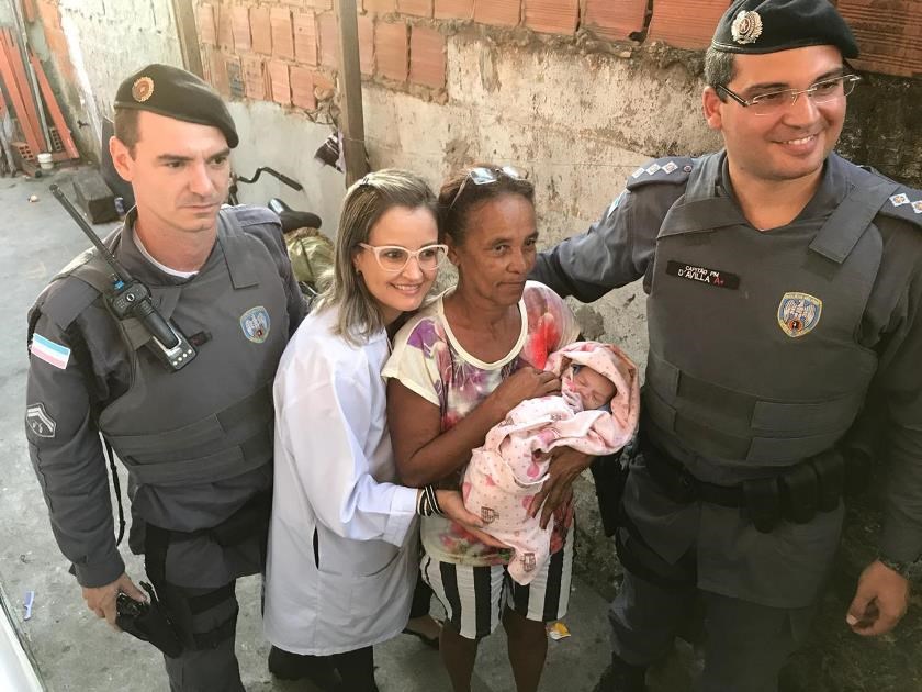 Emocionados, o subcomandante da 14ª Companhia Independente, capitão D’avilla e o Cb Berti, pretendem esta semana fazer uma visita à recém-nascida, com a qual posaram para foto, juntamente com a bisavó da criança e uma enfermeira. O nome da pequena é Ana Vitória.