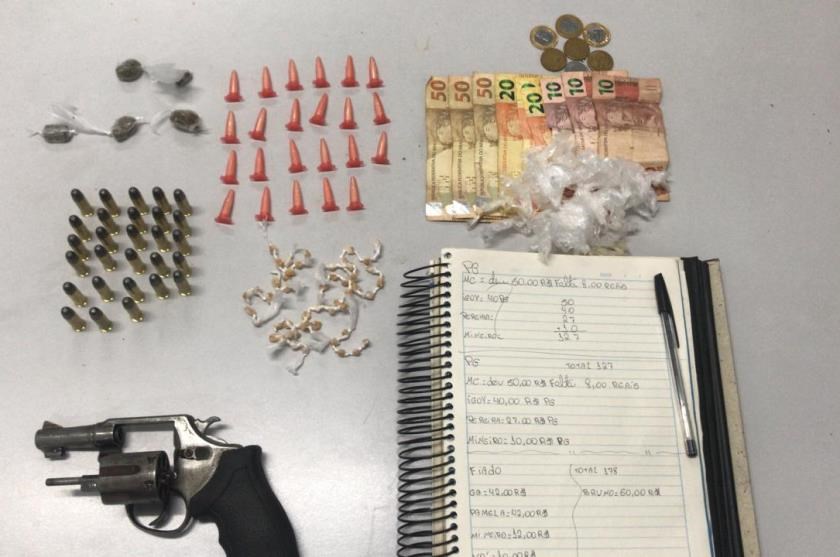 Dando continuidade ao flagrante os policiais encontraram nas residências dos suspeitos um revólver calibre 38 com numeração raspada, com uma munição intacta, um caderno contendo anotações do tráfico de entorpecentes, mais 27 munições de calibre 38 intactas, além de uma bolsa que havia sido enterrado num monte de areia contendo 23 pinos cocaína, cinco buchas de maconha e R$ 244,25 em espécie.