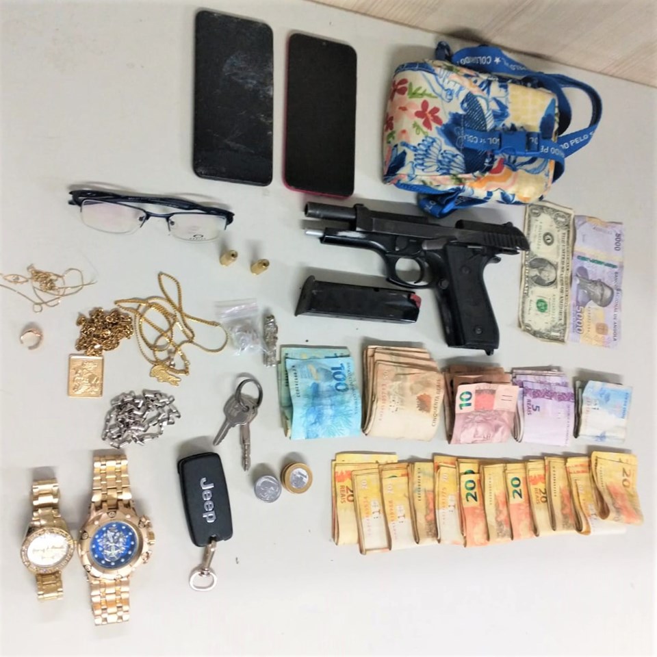 Uma das equipes se deparou com o veículo suspeito com três pessoas em seu interior. O carro era roubado e com os suspeitos foram encontradas uma pistola com numeração raspada, R$ 2.767,50 em espécie, joias, relógios e celulares.