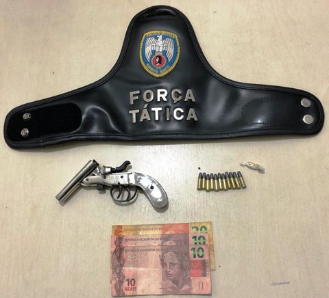 No sábado (26), com informações de que um adolescente estaria em posse de arma de fogo e comercializando entorpecentes no bairro Cacique, policiais militares da Força Tática realizaram buscas na localidade e encontraram o suspeito. Ele tentou fugir, dispensando o armamento que carregava, mas foi alcançado e apreendido. Próximo ao adolescente, os policiais encontraram uma garrucha calibre 22 de dois canos carregada com duas munições, nove munições calibre 22 e três pedras de crack.