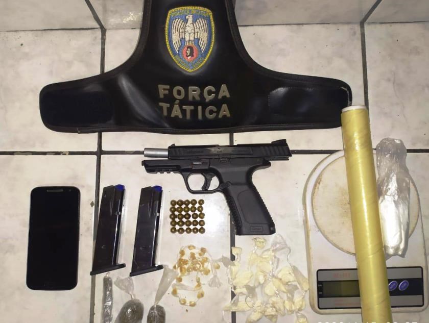 Os militares estavam patrulhando pela rua Pimenta, quando se depararam com dois homens em atitude suspeita. Ao perceberem a proximidade da viatura, os homens tentaram fugir, mas foram alcançados pela equipe. Com eles, os policiais apreenderam uma pistola calibre 9 mm, dois carregadores, 25 munições de calibre 9 mm, 25 papelotes de cocaína, 25 pedras de crack, três buchas de maconha e material para embalo de drogas.