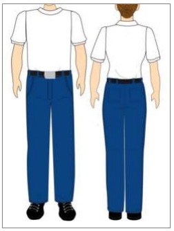 Para a apresentação no HPM, os discentes deverão portar APENAS UM DOCUMENTO DE IDENTICAÇÃO COM FOTO, trajando a seguinte vestimenta: camisa gola olímpica branca, calça jeans, cinto de nylon preto, tênis preto, meias brancas e máscara fabricada em tecido de algodão na cor PRETA (sem estampas, marcas ou desenhos), conforme imagem ilustrativa a seguir;