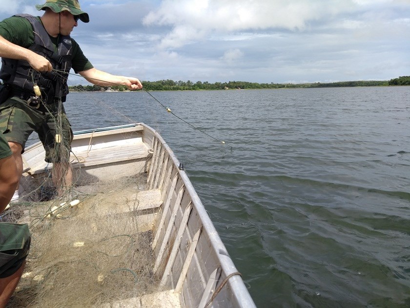 Durante a ação de fiscalização, foram avistadas três redes de emalhar armadas de forma irregular, contrariando as normas ambientais vigentes. As redes esticadas ultrapassavam em 1/3 a largura do ambiente aquático, além disso, uma das redes tinha a malha inferior ao permitido.