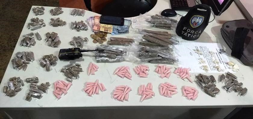 Durante patrulhamento nos becos do bairro São Benedito, militares da Força Tática se depararam com diversos indivíduos, que ao perceberem a presença policial fugiram em direção a Rua do Chafariz. Em acompanhamento foi possível realizar a apreensão de um adolescente de 16 anos, e com ele recolher 154 buchas de maconha, 42 palitos de maconha, 105 pinos de cocaína, 61 pedras de crack, cinco papelotes de cocaína, cinco bolas de haxixe, um rádio comunicador e R$ 148,15 em espécie.