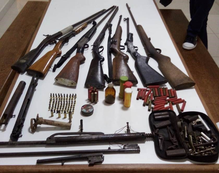 Após averiguar uma denúncia de posse irregular de arma de fogo e caça ilegal no distrito de Fazenda Guandu, os policiais apreenderam sete espingardas, 98 munições intactas e 37 deflagradas, uma armadilha, além de diversos componentes de arma de fogo e material para recarga de munição.