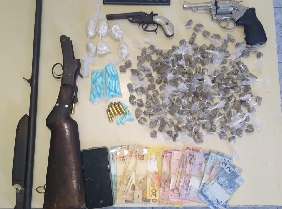Ao realizarem buscas no imóvel, os policiais encontraram três armas de fogo, sendo um revólver calibre 38, carregado com seis munições, uma garrucha calibre 32 e uma espingarda calibre 32. Foram ainda encontradas 192 buchas de maconha, 53 pinos de cocaína e 221 pedras de crack.