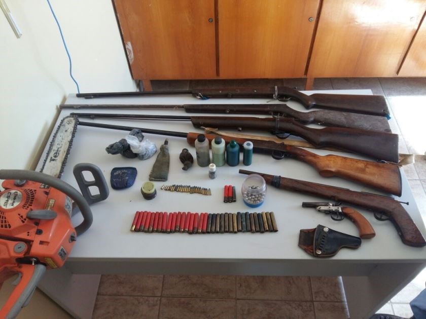 Foram apreendidas uma garrucha calibre 22, uma espingarda calibre 36, três espingardas de fabricação caseira, uma garrucha de fabricação artesanal, 24 munições calibre 22, 35 cartuchos calibre 36, dois potes de espoleta, um pote contendo várias esferas, quatro potes de pólvora, um frasco de chumbo, um coldre de couro e um motosserra.