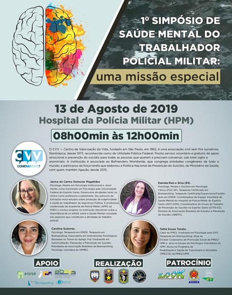 Participam do Simpósio a psicóloga e mestre em Psicologia Institucional, e doutoranda, Janice do Carmo Demuner Magalhães, a psicóloga e doutora em Psicologia Clínica, Daniela Reis e Silva, a psicóloga e terapeuta em EMDR, Carolina Guterres e a graduada em psicologia e cabo da PMES, Talita Souza Toneto, além da coordenação do Centro de Valorização da Vida (CVV).
