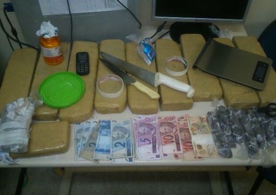 Ao todo, os policiais apreenderam aproximadamente 10 quilos da droga, divididos em 9,5 kg em tabletes, 112 buchas da mesma substância, além de uma balança de precisão e R$ 157,00 em espécie.